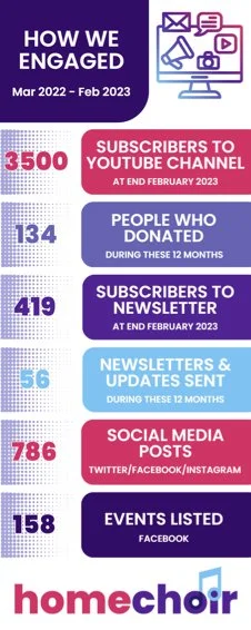 Homechoir became a non-profit company limited by guarantee (CLG) in January 2023, and officially started trading in April 2023. The Homechoir YouTube channel and “Homechoir” trademark, hitherto owned by Ben England Music Ltd, are now owned by the Homechoir CLG.